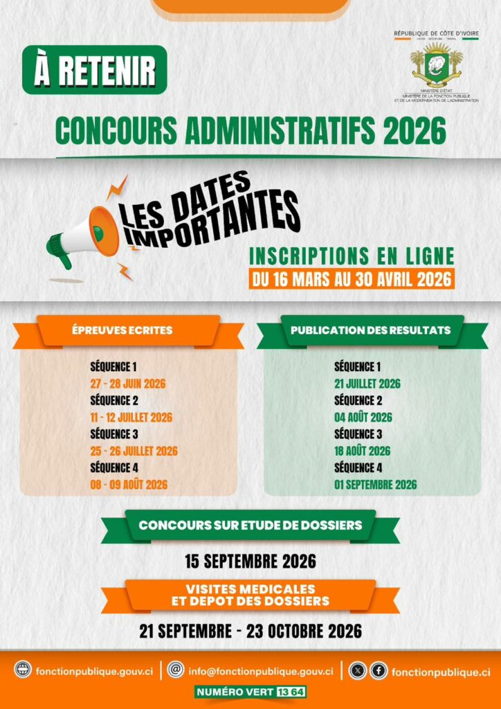 Pour les candidats qui composeront les 27 et 28 juin prochain, la proclamation des résultats aux concours administratifs se fera le 21 juillet 2026, selon le planning mis en place par le ministère de la fonction publique. Les dernières délibérations aux concours administratifs sont prévues pour le 1er septembre 2026. Les concours sur étude de dossier auront le 15 septembre prochain en Côte d’Ivoire. Les candidats admis aux concours administratifs entameront les visites médicales à partir du 21 septembre 2026, conformément au calendrier. Cette année, plus de 490 concours ont été lancés au niveau de la fonction publique, dont 14 concours directs d’accès à la fonction publique.