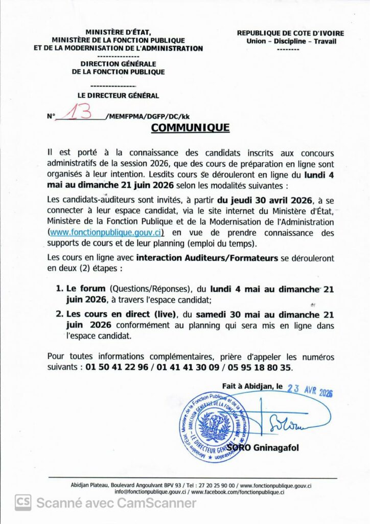 Les candidats-auditeurs sont invités, à partir du jeudi 30 avril 2026, à se connecter à leur espace candidat, via le site internet du Ministère d’État, Ministère de la Fonction Publique et de la Modernisation de l’Administration (www.fonctionpublique.gouv.ci) en vue de prendre connaissance des supports de cours et de leur planning (emploi du temps).», déclare le directeur général de la fonction publique dans un communiqué officiel. Les sessions de cours se dérouleront en deux phases. La première phase sera une session de questions/réponses appelé Forum. Cette session démarre le lundi 4 mai pour prendre fin le 21 juin prochain.