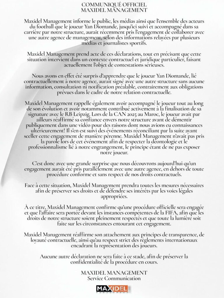 «Face à cette situation, Maxidel Management prendra toutes les mesures nécessaires afin de préserver ses droits et de défendre ses intérêts par les voies légales appropriées. À ce titre, Maxidel Management confirme qu’une procédure officielle sera engagée et que l’affaire sera portée devant les instances compétentes de la FIFA, afin que les droits de notre structure soient pleinement respectés et que toute la lumière soit faite sur les circonstances entourant cet engagement.», lisons-nous dans le communiqué de la structure. Le footballeur ivoirien Yan Diomandé est donc face à une éventuelle plainte à la FIFA. Le footballeur ivoirien a récemment signé un contrat avec l’agence Roc Nation International, une structure qui s’occupe notamment de la carrière du brésilien Vinicius.