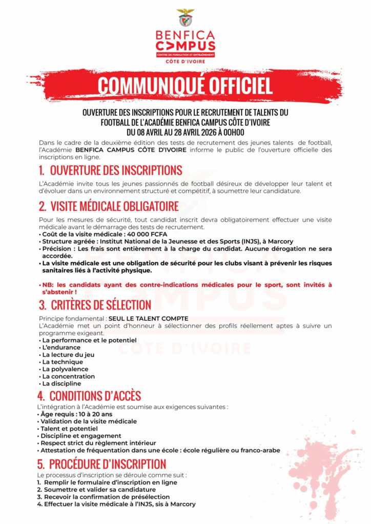 Le test BENFICA Campus Côte d’Ivoire est une occasion en or pour certains talents. Après une première édition couronnée de succès, la seconde édition de détection de recrutement de talents en Côte d’Ivoire est officiellement lancée. Les inscriptions en ligne se font sur la plateforme benficacampus-ci.com. Les inscriptions en ligne sont entièrement gratuites, selon les informations dont nous disposons. Mais il y’a quelques conditions à satisfaire pour prendre part au test de recrutement BENFICA Campus Côte d’Ivoire lancé en avril 2026. Première condition, le talent doit être âgé de 10 à 20 ans maximum. Au-delà, il ne peut prendre part au test de recrutement et de détection de talent.